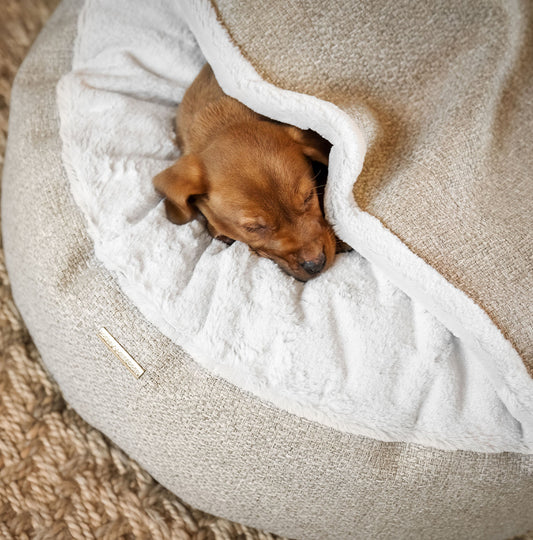Cozy & Calming Puppy Cage Bed In Mink Bouclé by Lords & Labradors