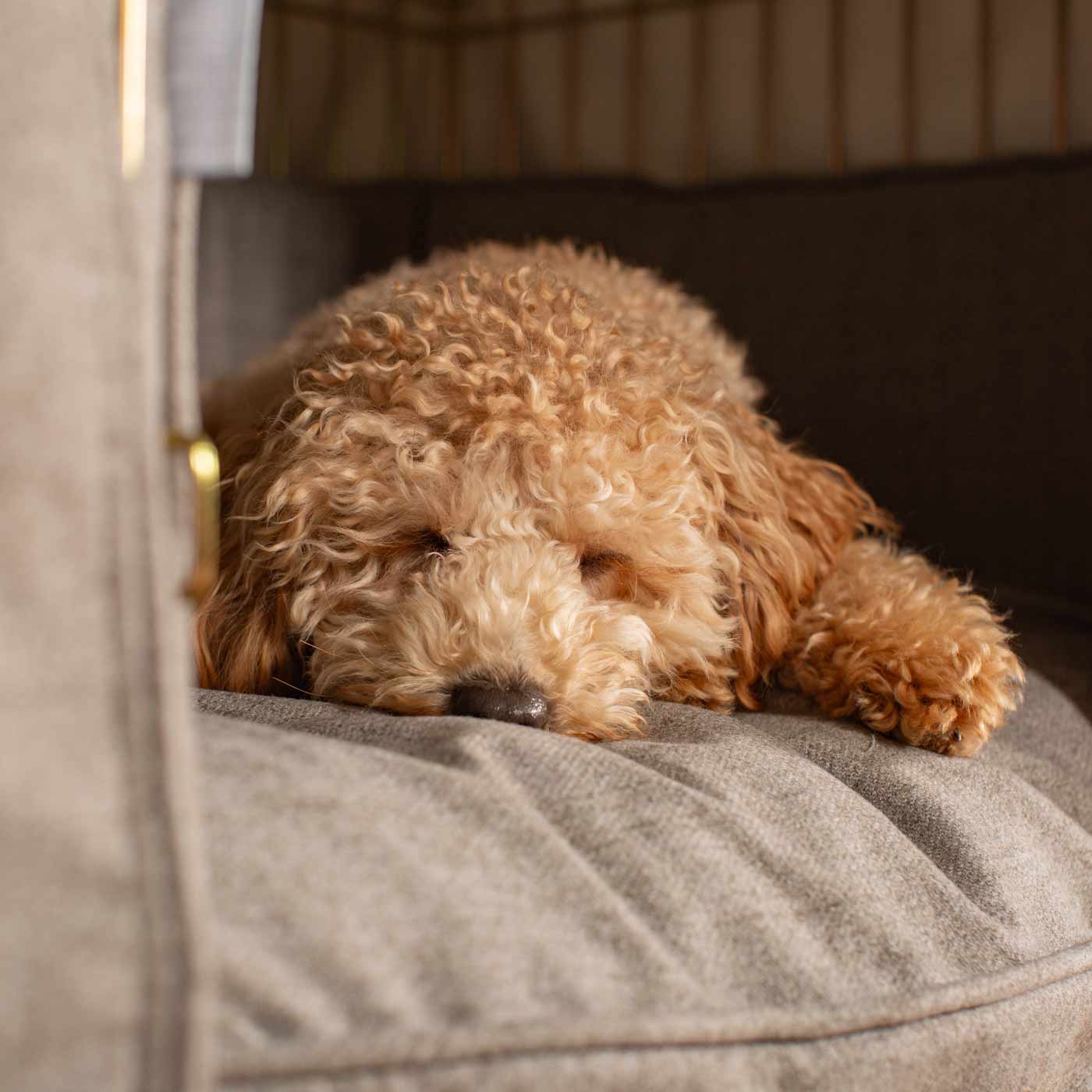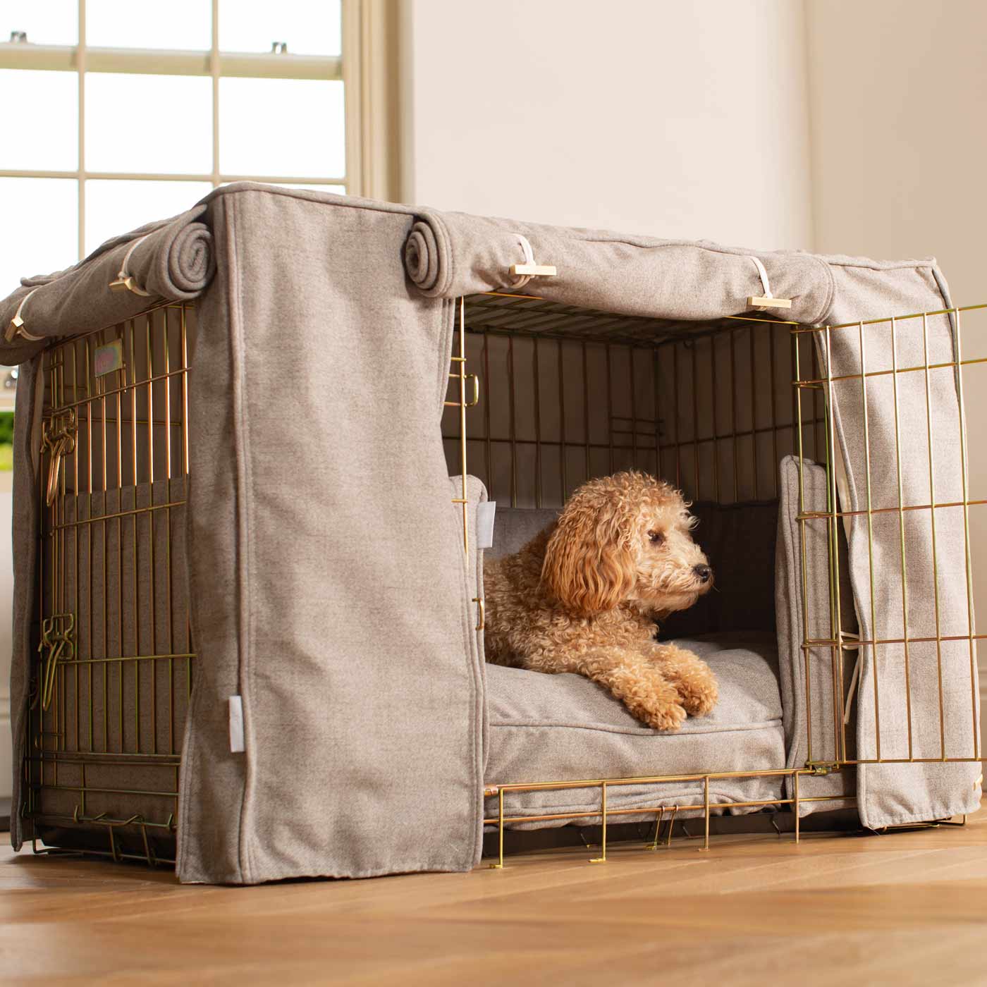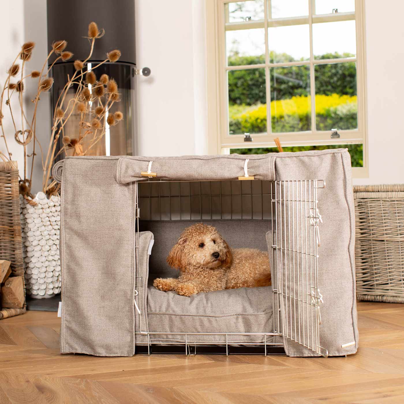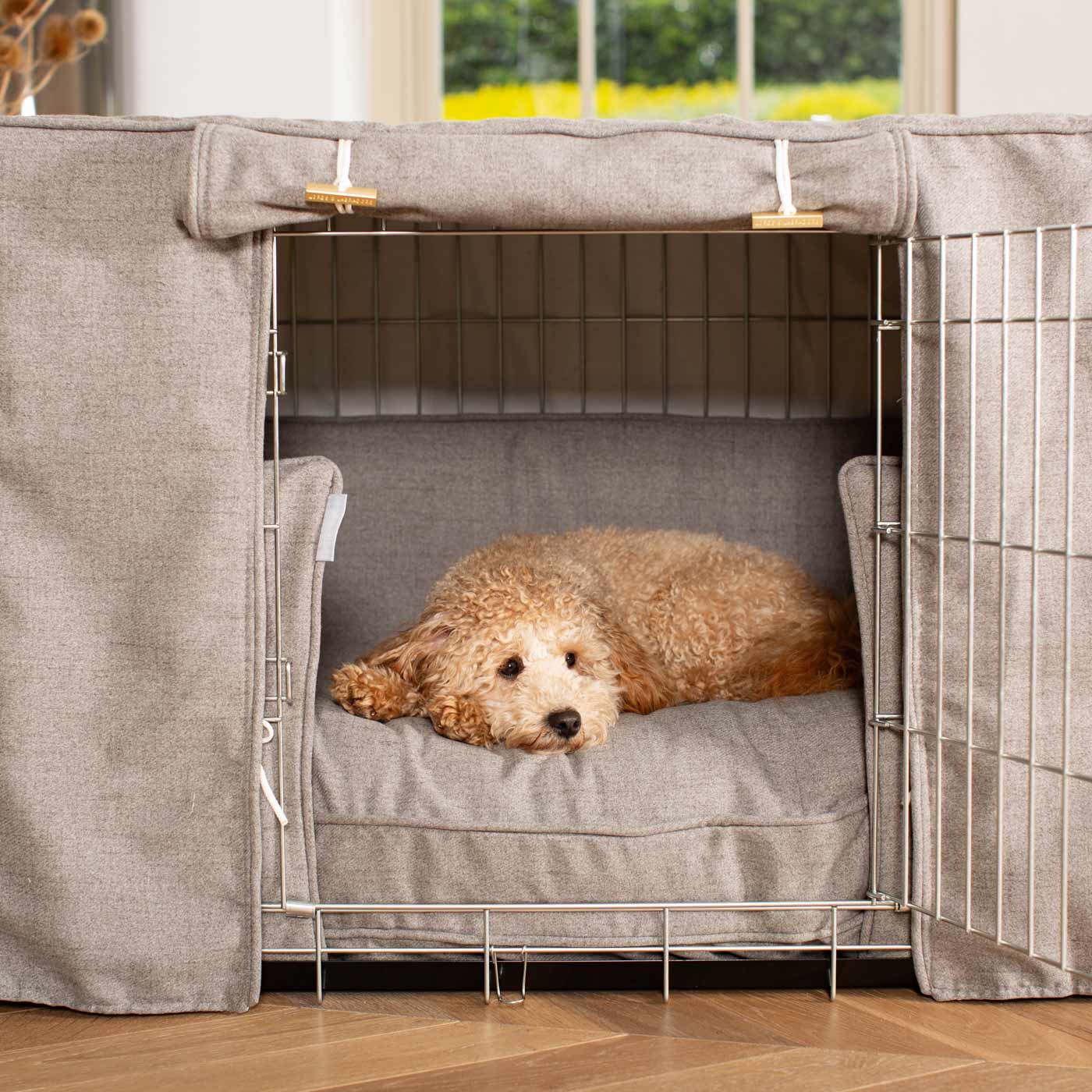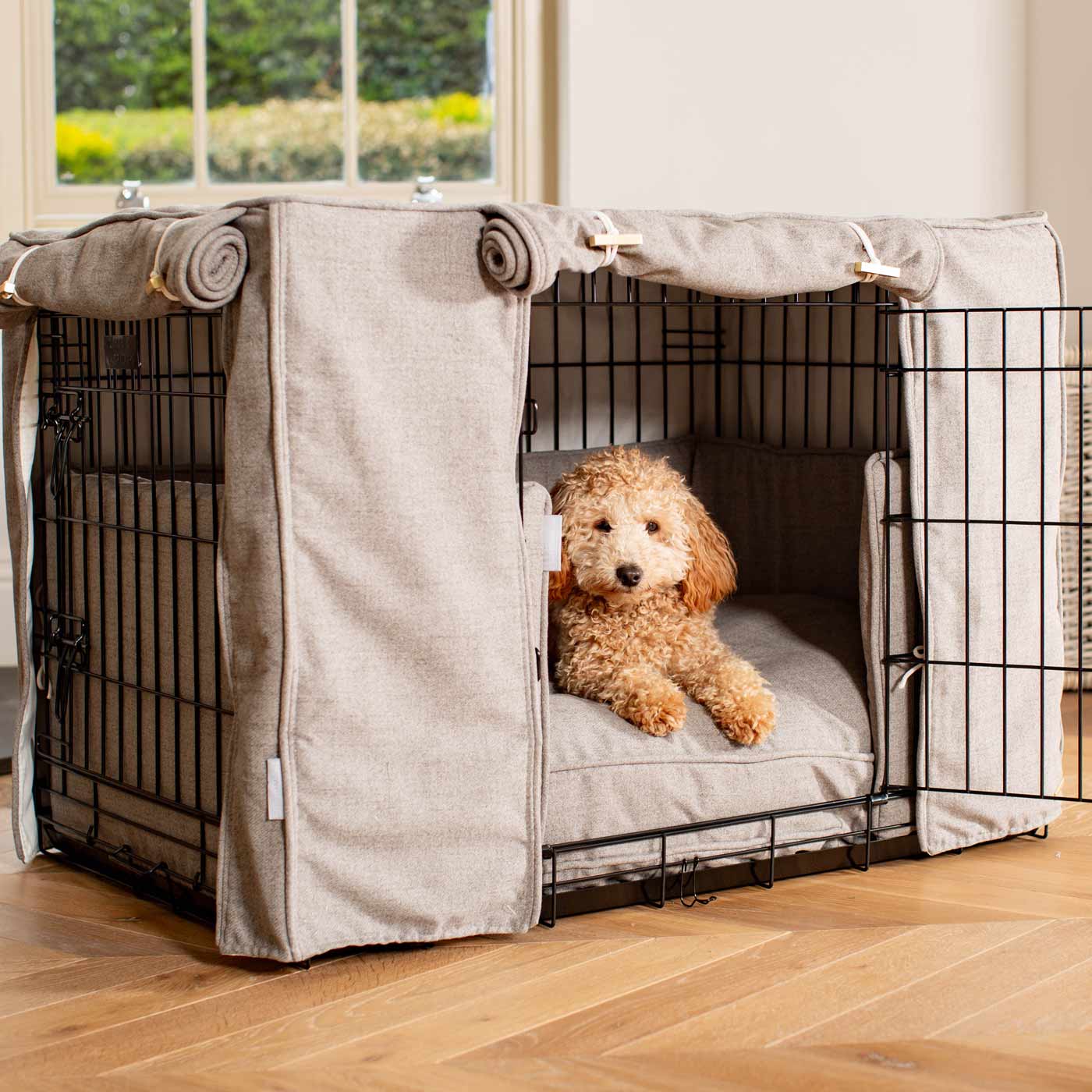 Experience ultimate comfort and safety for your pup with the Dog Crate Set by Lords & Labradors. Made with Inchmurrin wool, it's perfect for cozy naps and maintaining puppy comfort. The set includes a crate, cover, cushion, and bumper, featuring metal toggles and personalization options. Ideal for training, bedtime routine, and development.